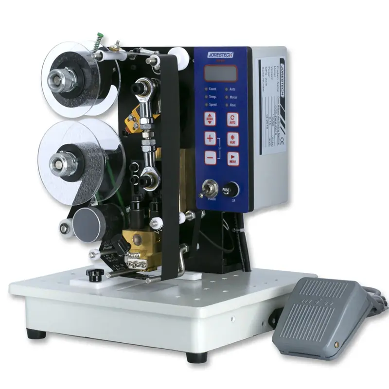 Es un codificador semiautomático alternativo eléctrico, que utiliza cinta de estampado en caliente en lugar de tinta líquida. El estampado en papel de aluminio, el estampado en caliente o el estampado en caliente es la aplicación de papel de aluminio pigmentado o metálico al papel mediante presión y un troquel calentado.